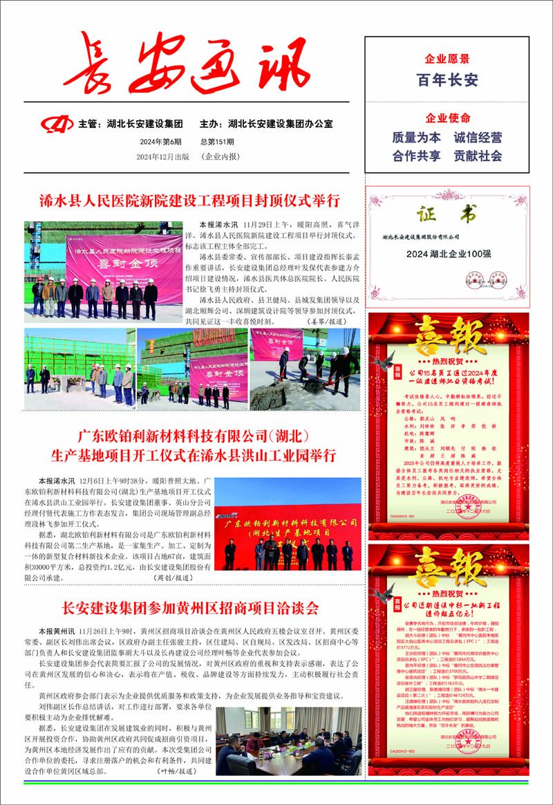 • 2025-09-27 湖北長安建設(shè)集團股份有限公司 榮獲2025湖北民營企業(yè)100強稱號,位列第35名